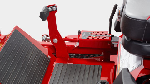 Foot-operated deck lift, with adjustable pedal, can change cut height in 1/4″ increments from 1.5″- 4.5″.